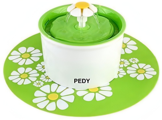 Mata silikonowa w kształcie stokrotki W zestawie znajduje się mata silikonowa, która chroni podłogę przed rozchlapywaniem wody i zapobiega przesuwaniu się fontanny. Jest nie tylko praktyczna, ale również stanowi estetyczny dodatek do wnętrza.
