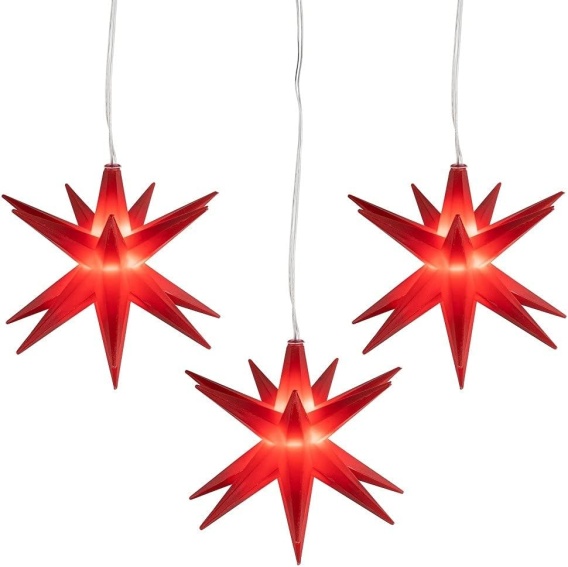 3 pojedynczo pakowane trójwymiarowe gwiazdy LED do zawieszenia, Ø 10 cm, długość przezroczystego kabla: ok. 1,5 m, z 16 promieniami, 1 dioda LED w kolorze ciepłej bieli z praktyczną funkcją timera, czerwona.