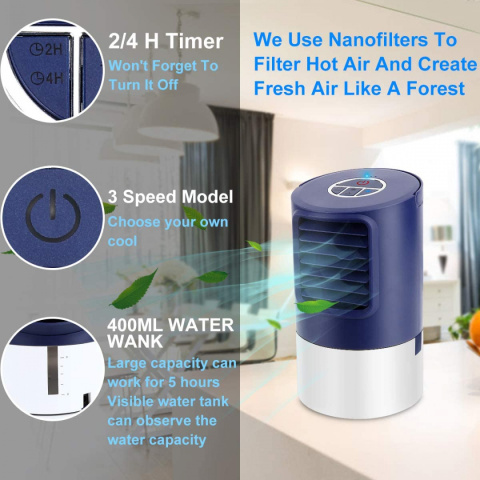 Nasz mały klimatyzator jest połączeniem wentylatora, nawilżacza i klimatyzatora i jest wyposażony w chłodnicę powietrza, nawilżacz i nastrojowe światło LED. Możesz używać go tylko jako wentylatora (3 prędkości) lub dodać lód/wodę/olejki eteryczne, aby zamienić go w mini klimatyzator, generując wilgotne, świeże i zimne powietrze. Pamiętaj, aby najpierw dodać wodę!